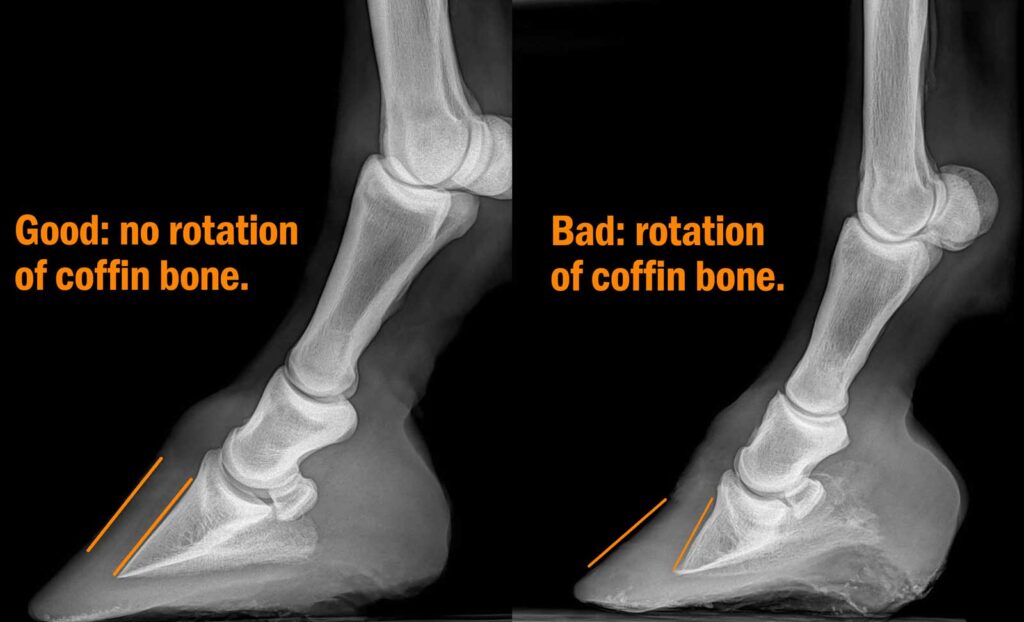Founder (aka laminitis) in horses is a very serious condition of the foot caused by the coffin bone rotating and pointing towards the horse’s sole. This is extremely painful and in some instances it may be necessary to euthanize the horse.